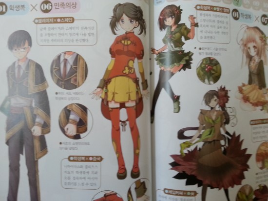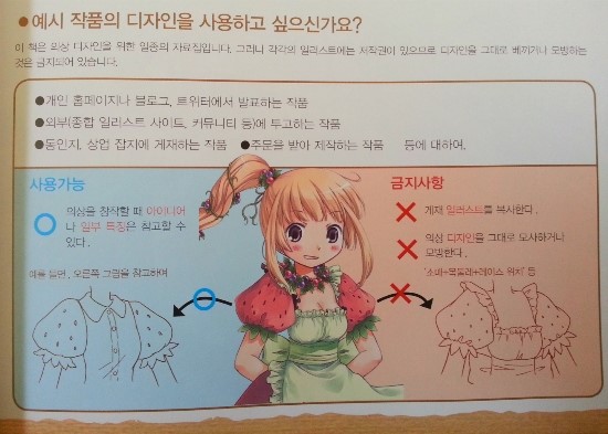책에서 가장 참고로 할 만한 정보로는 의상 디자인이 어려울 때 기본적인 의상들- 평상복, 학생복, 군복, 전통복-에 특정 속성들 예를 들자면 물, 불, 바람, 식물과 같은 자연적인 것에서부터 기계, 동물, 사계절에서부터 두 가지 종류의 의상 속성을 하나로 합치는 것 등입니다. 위의 페이지에 실린 것은 학생복과 전통복의 혼합과 학생복과 자연적인 요소를 합친 것을 묘사한 것. 만약 현대를 배경으로 하는 작품이라면 참고로 할 만한 자료들 사진이나 잡지 같은 것들이 있겠지만 판타지나 비일상적인 요소를 다루는 작품이라거나 현대를 배경으로 한 판타지 같은 경우 참고가 될 만한 내용들이 많았습니다.