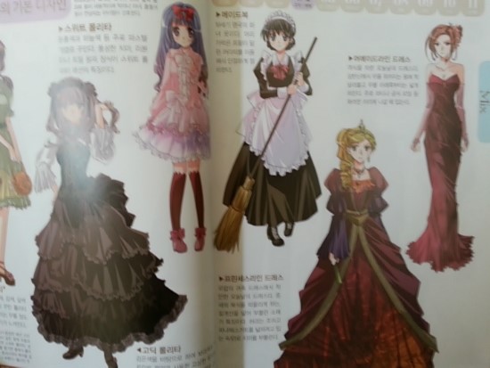 책에서 설명하는 의상 디자인의 한 종류로 예시는 고딕, 예복의 기본 디자인. 외에도 학생복, 평상복, 군복, 전통복 등 여러 종류의 의상이 설명되어 있습니다. 책의 내용은 예전에 참고로 빌려본 적 있는 일러스트 작법서처럼 예시로 여러 그림과 참고로 할 만한 설명들이 첨부되어 있는 형식이에요. 예를 들어 의상에 대해 무지한 사람들을 위해서 의상에 대한 명칭 - 실은 여기서 제가 모르던 옷 종류에 대해서도 어느 정도 알게 된 바 있습니다- 도 실려 있어요. 뿐만 아니라 쉬어가는 페이지에선 의상을 이루는 재질의 차이점이나 의상 종류에 따른 카라와 소매의 차이 같은 것도 다루고 있어서 굉장히 상세한 설명을 이루는 바입니다.